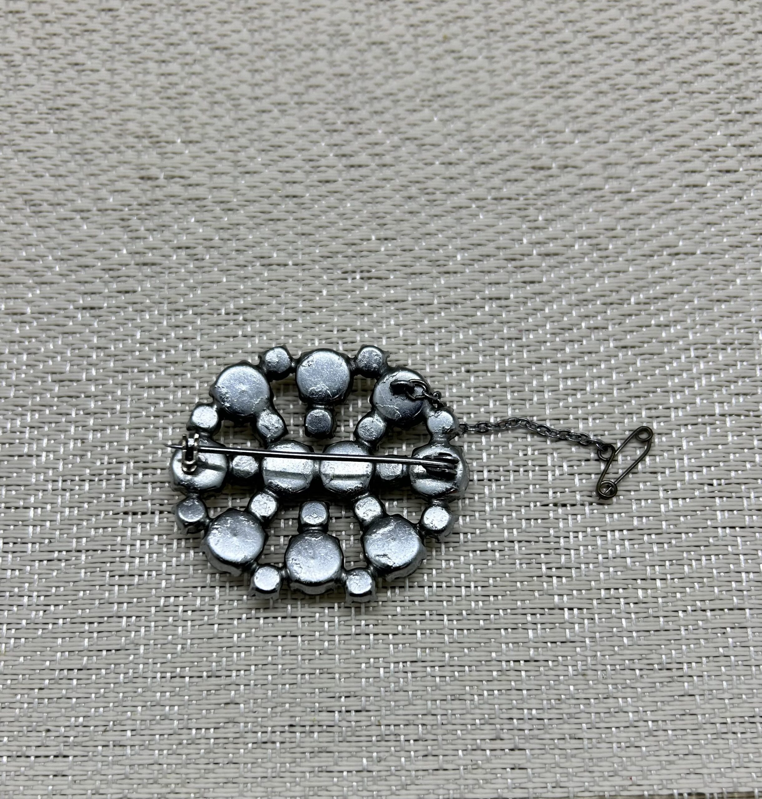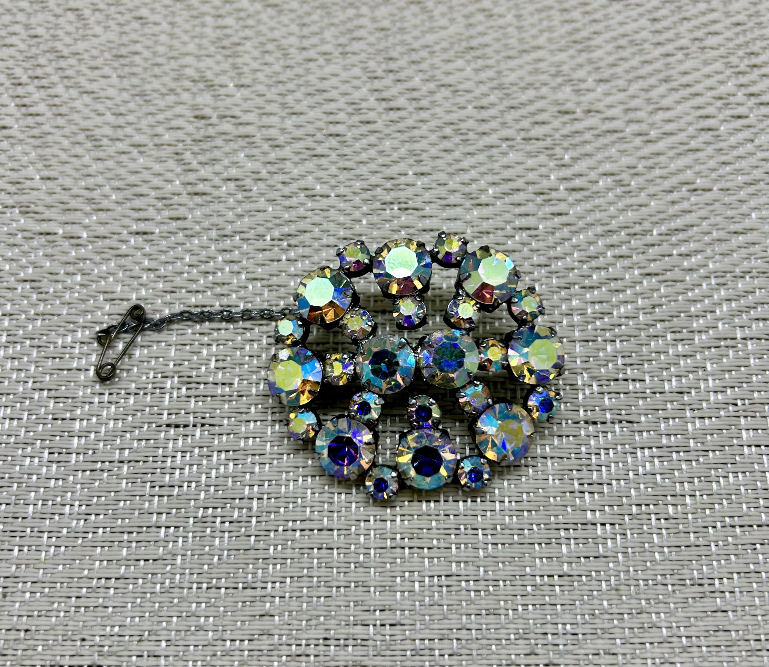 Beautiful 60’s Aurora Borealis rhinestone brooch. Complete with safety chain. This is a beautiful vintage piece in excellent condition.