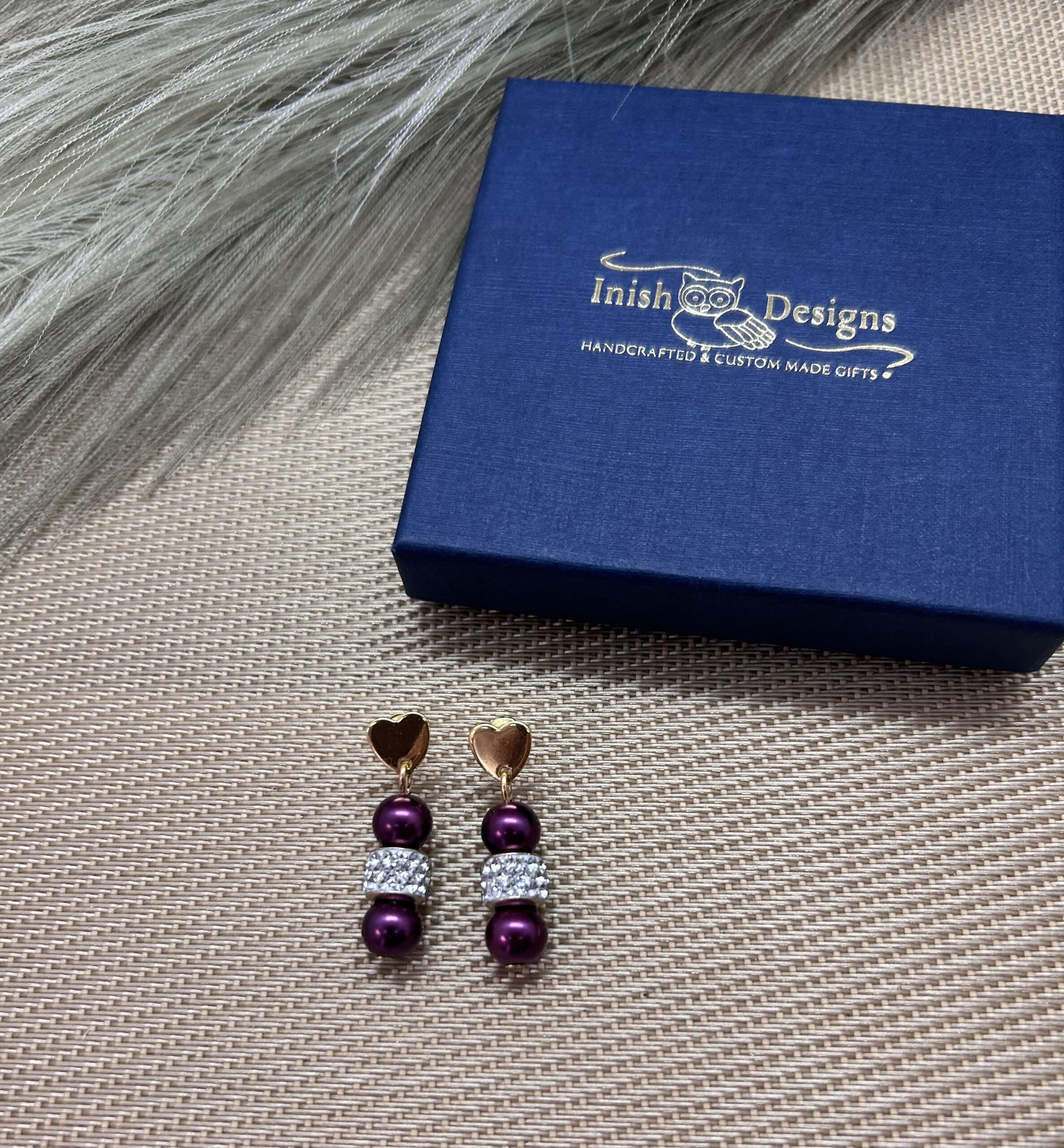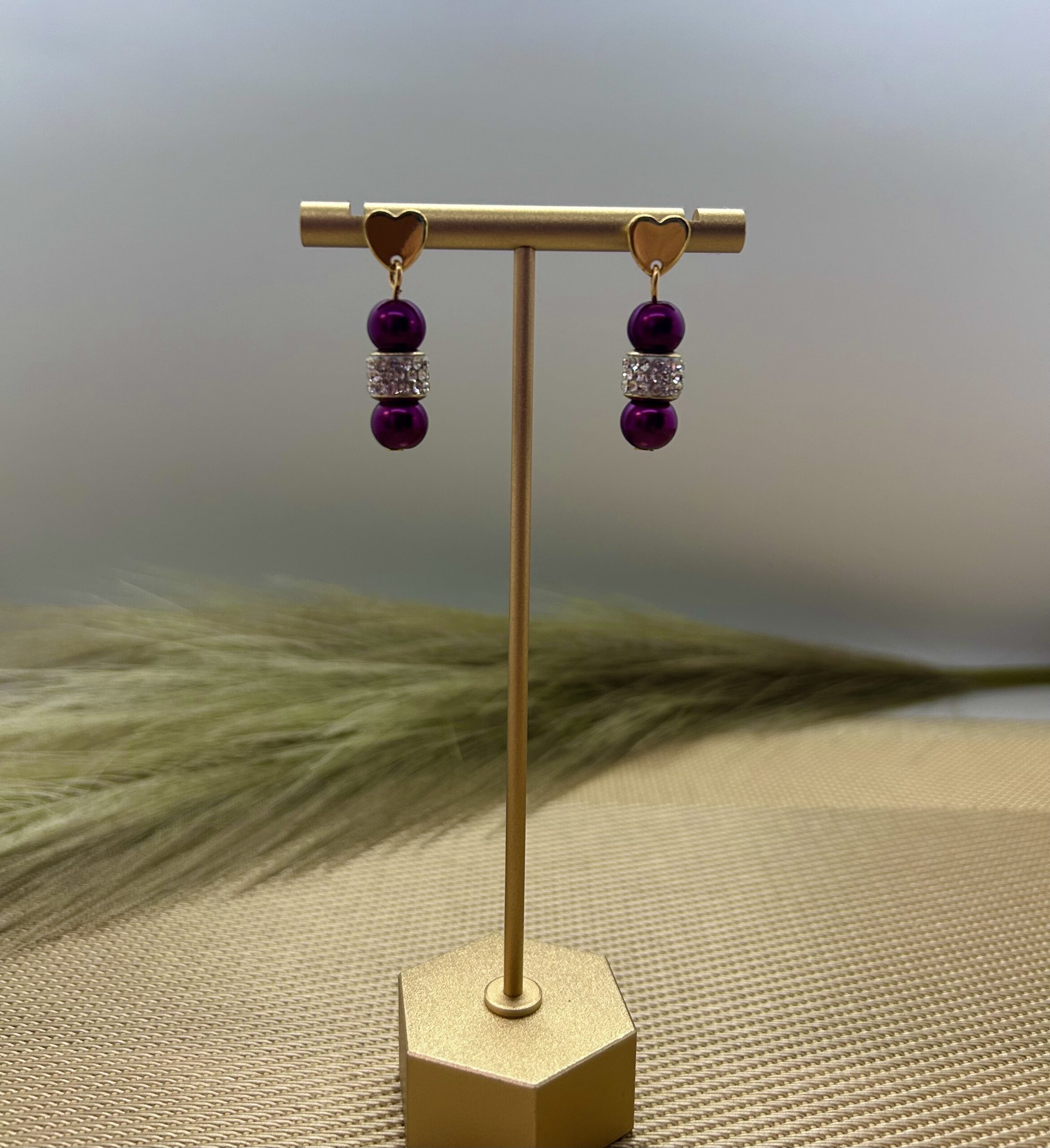 Burgundy beads divided with a ring of cubic zirconia on gold plated heart earrings post. Classic, elegant and the seasons perfect colour.