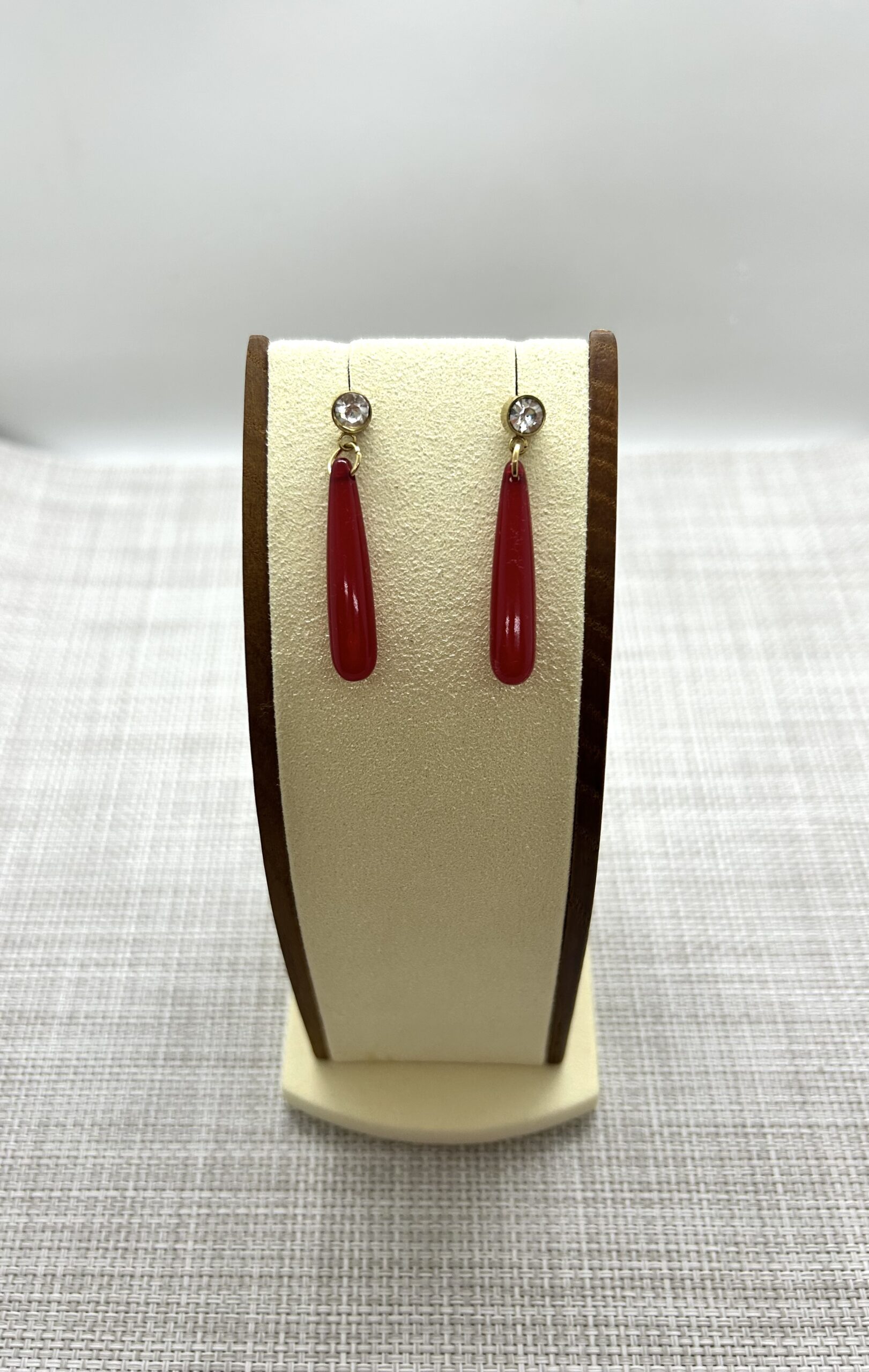 Cubic Zirconia stud post holds a red acrylic drop.