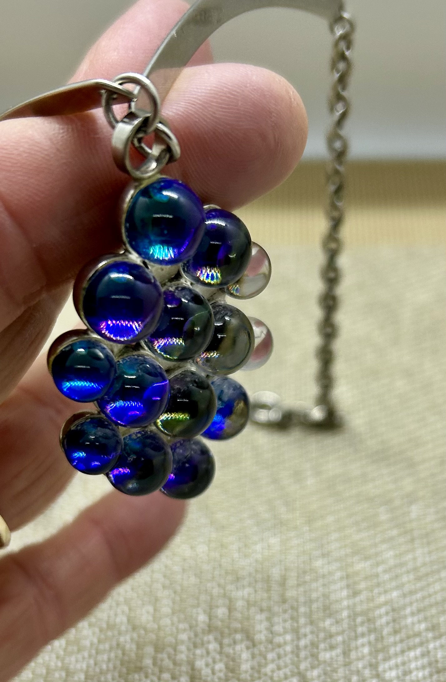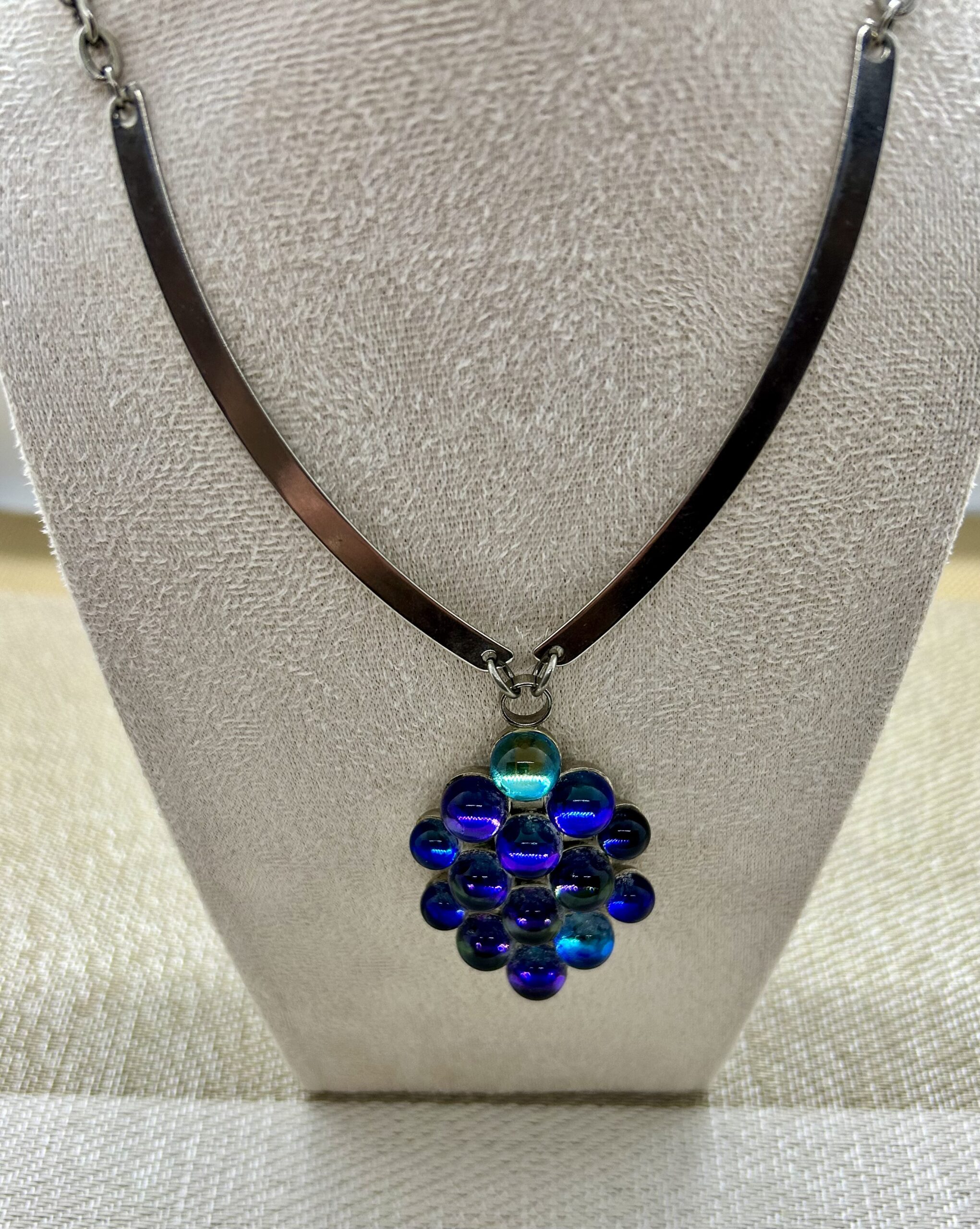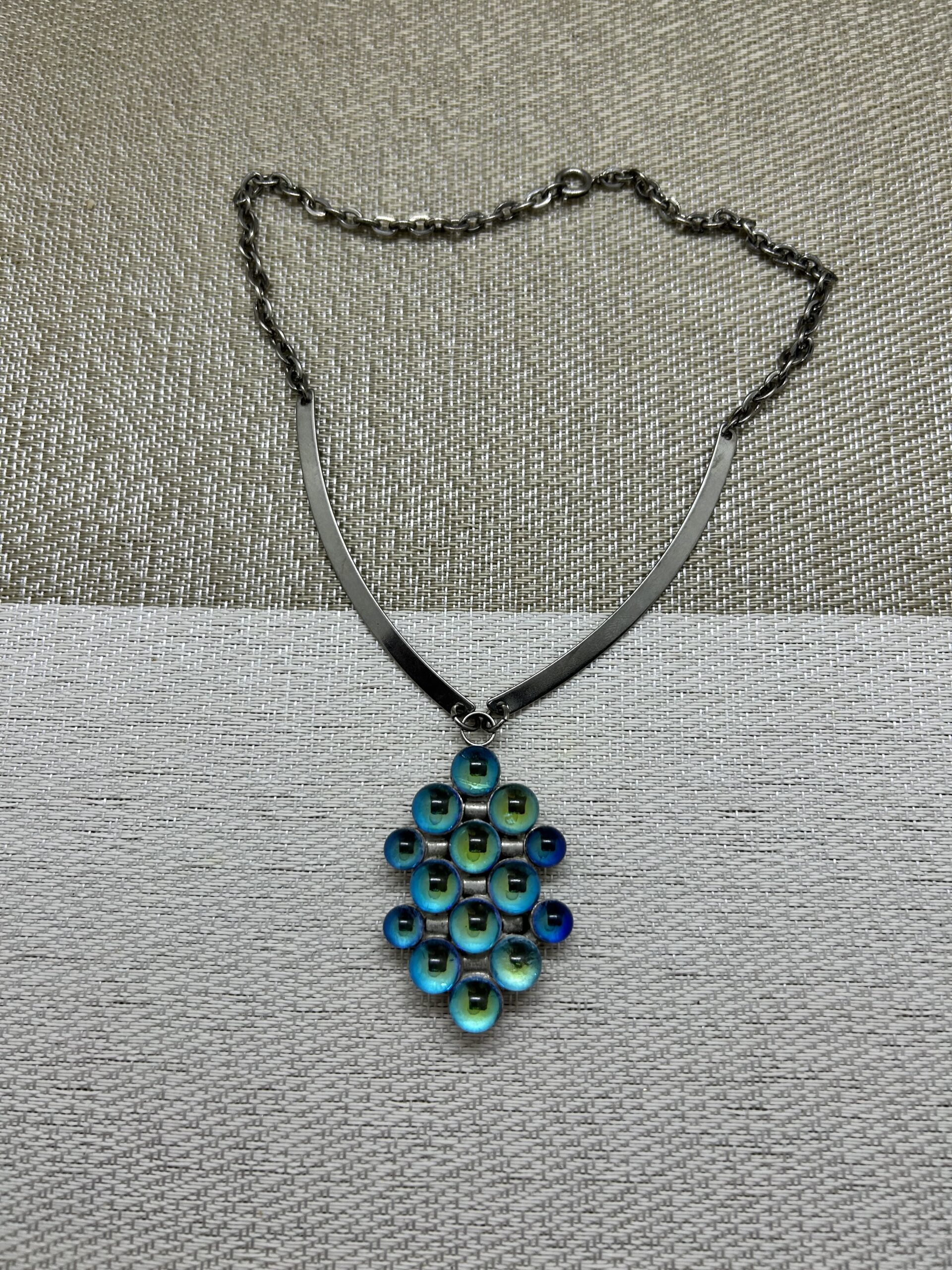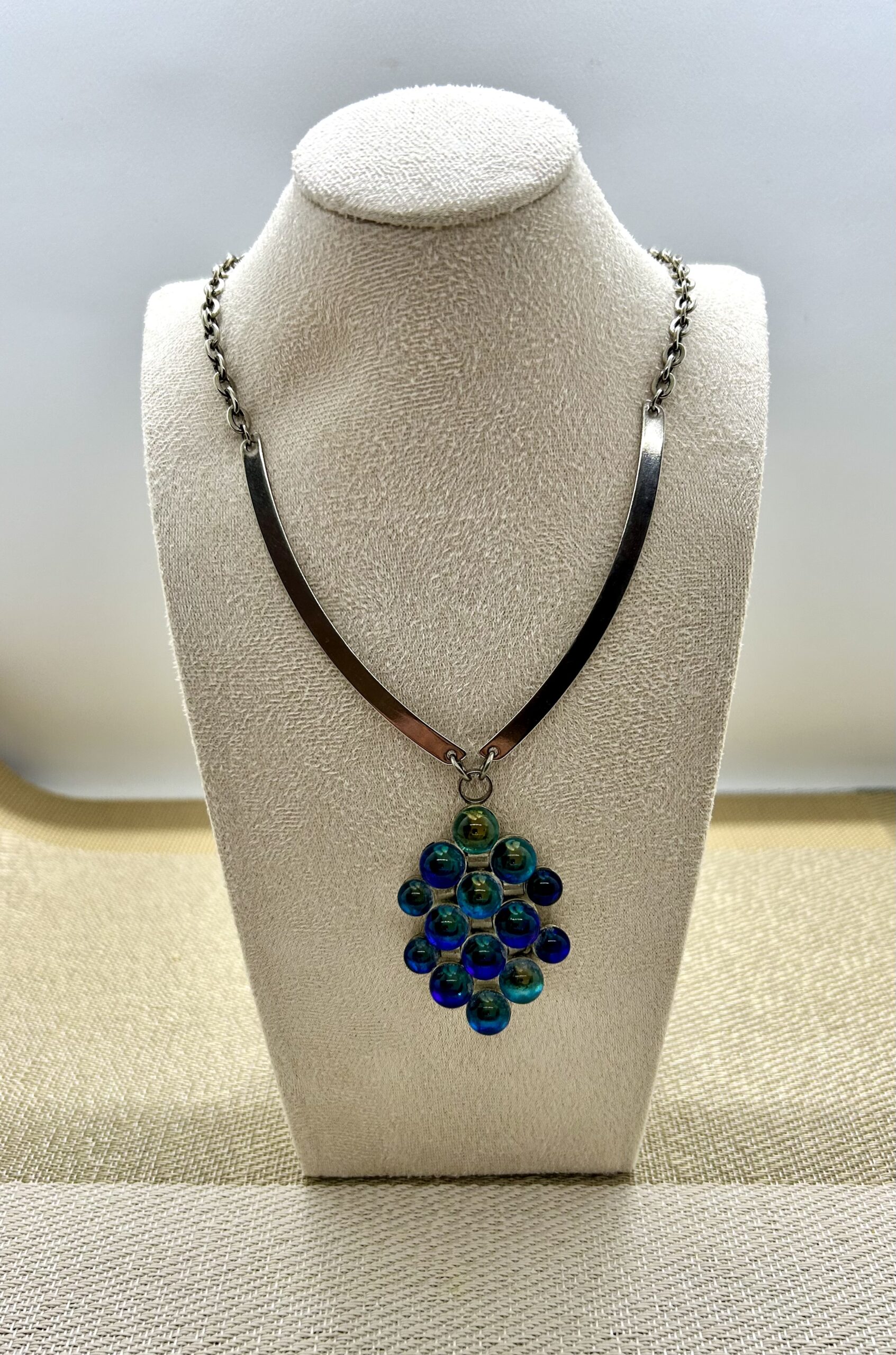 Unusual pendant consisting of glass balls with some kind of iridescence inside. It is a lovely vintage 70’s piece with silver tone chain. In excellent condition.