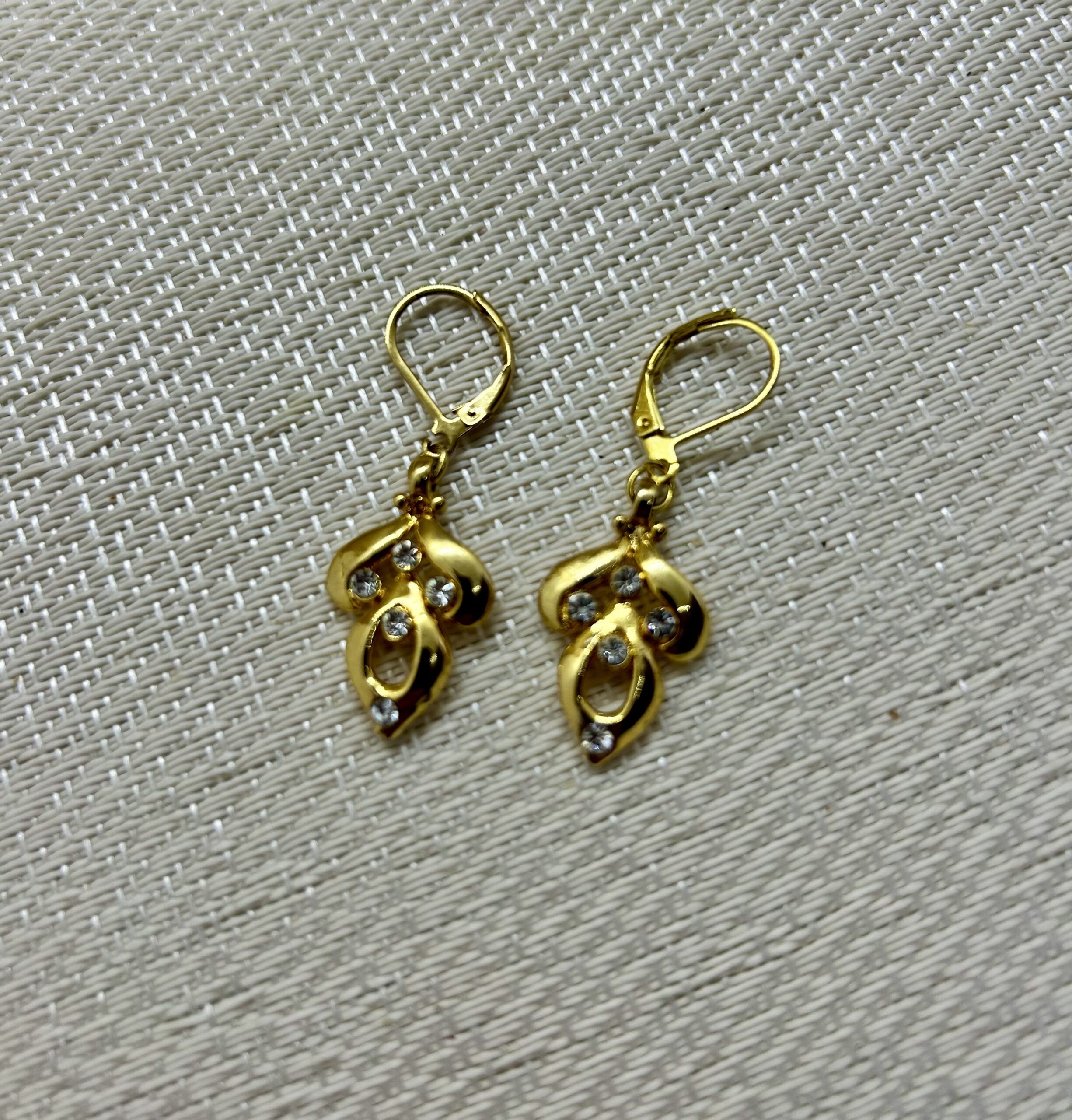 Beautiful gold plated and diamanté leaf charm hand from gold plated earring hooks. Classic and timeless