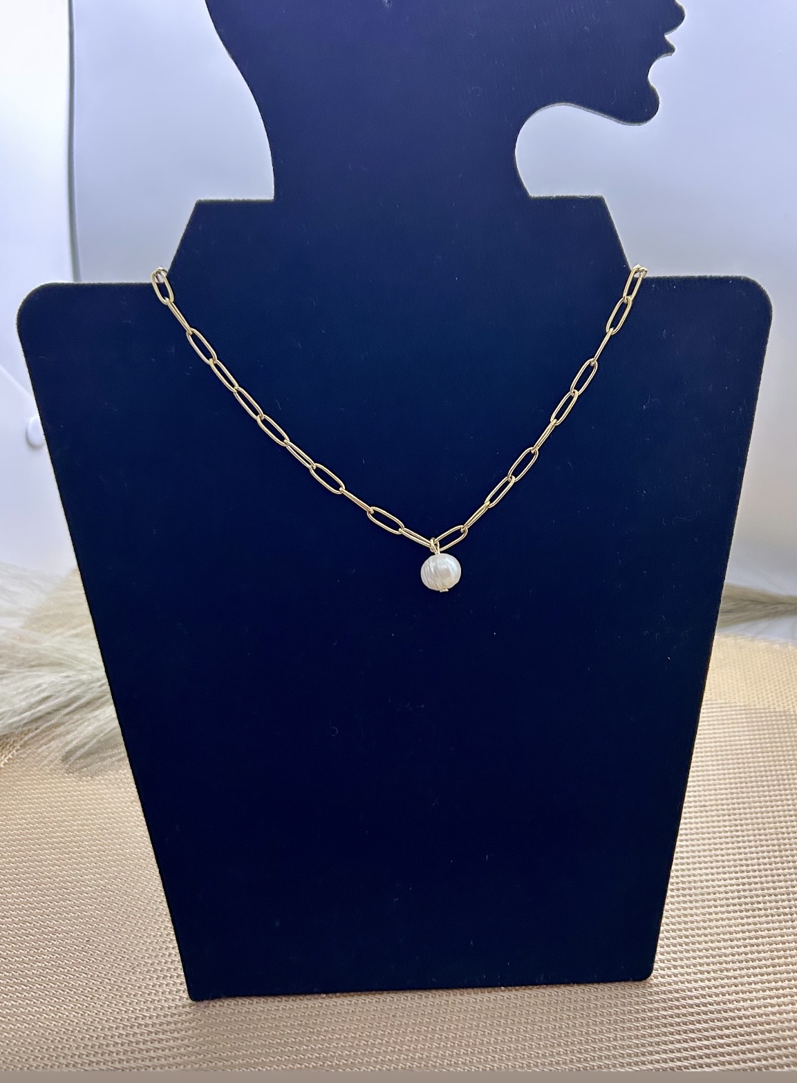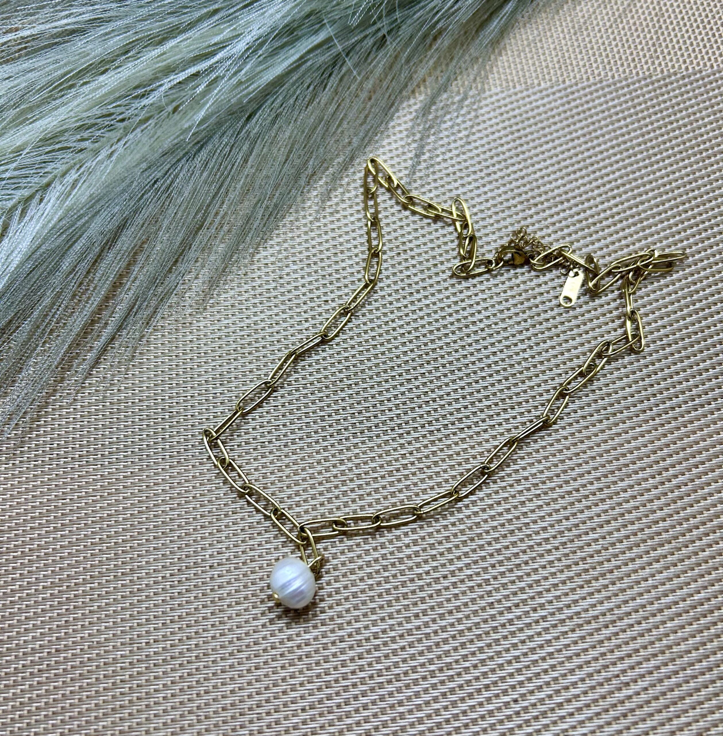 Gold plated stainless steel paper clip chain with genuine freshwater Pearl.