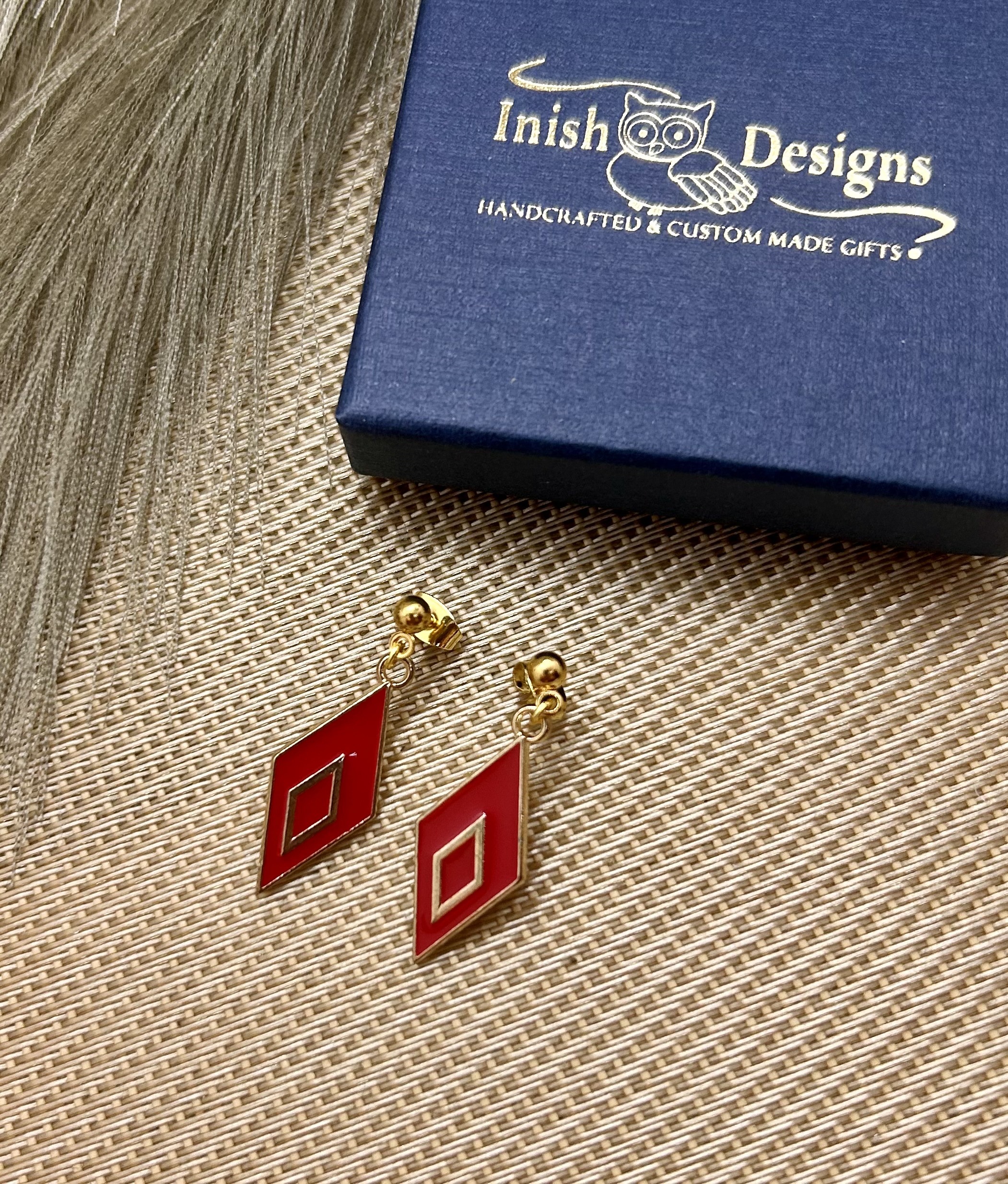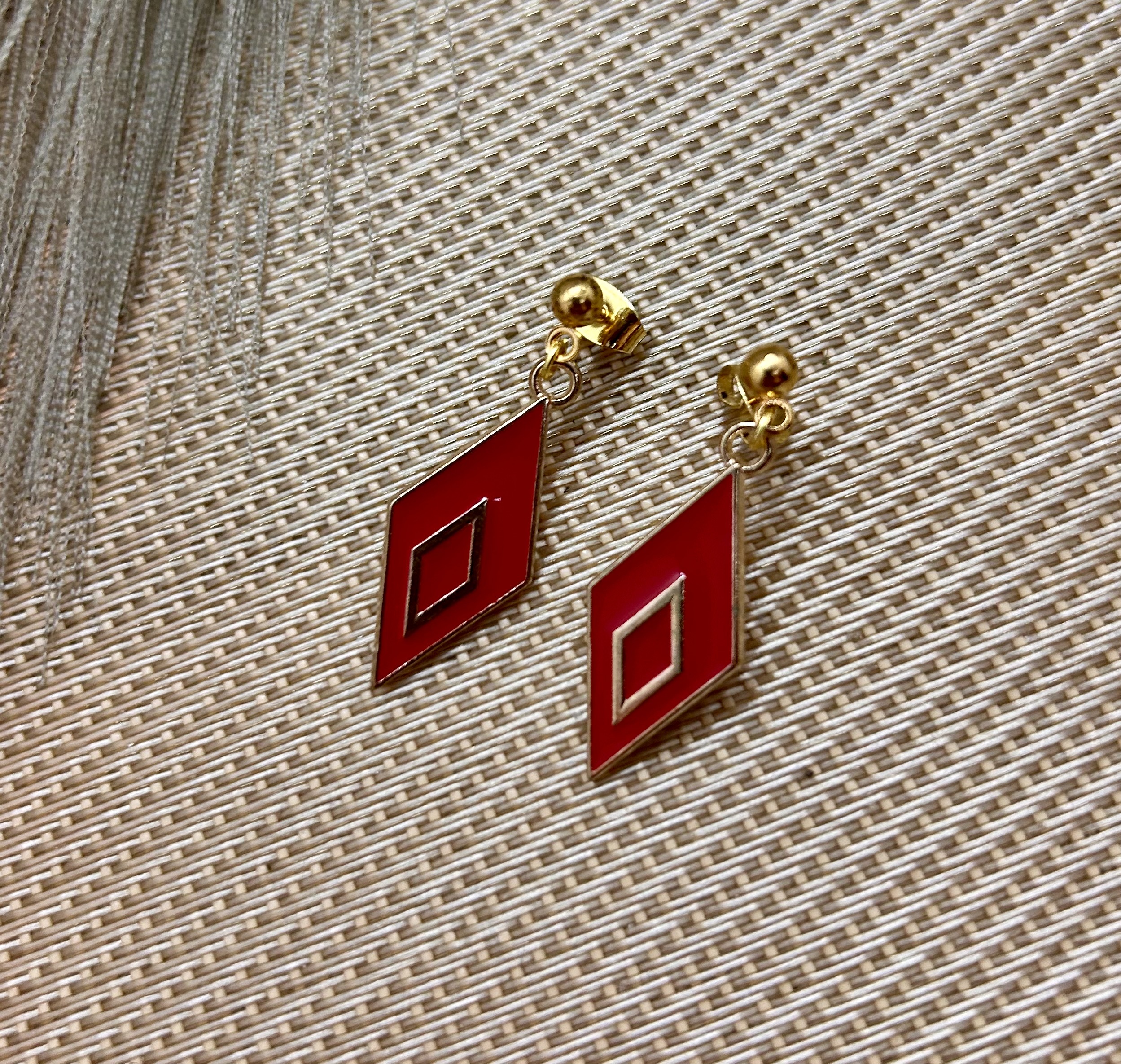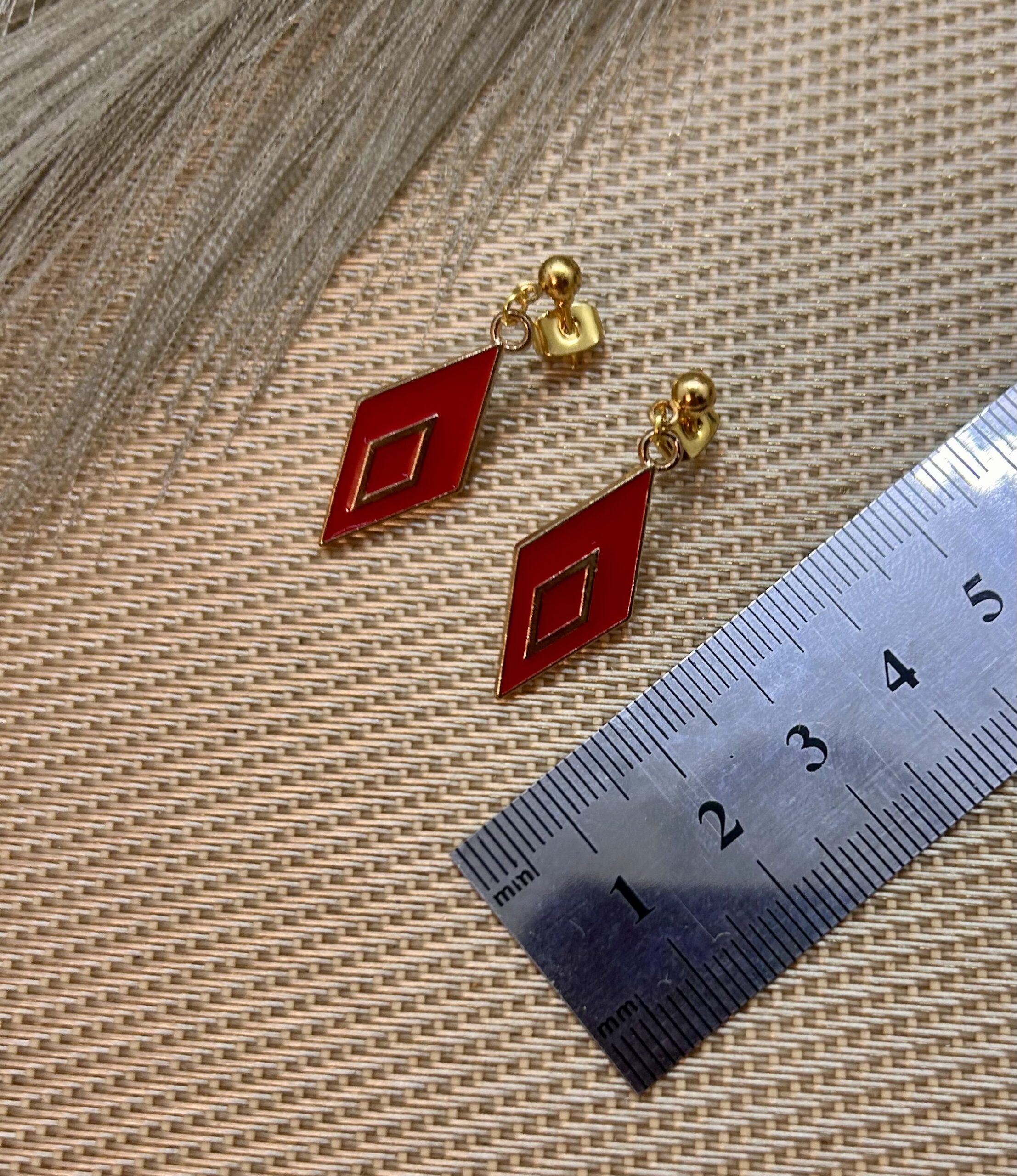 Red enamel and gold plated diamond shape earrings on stud posts.