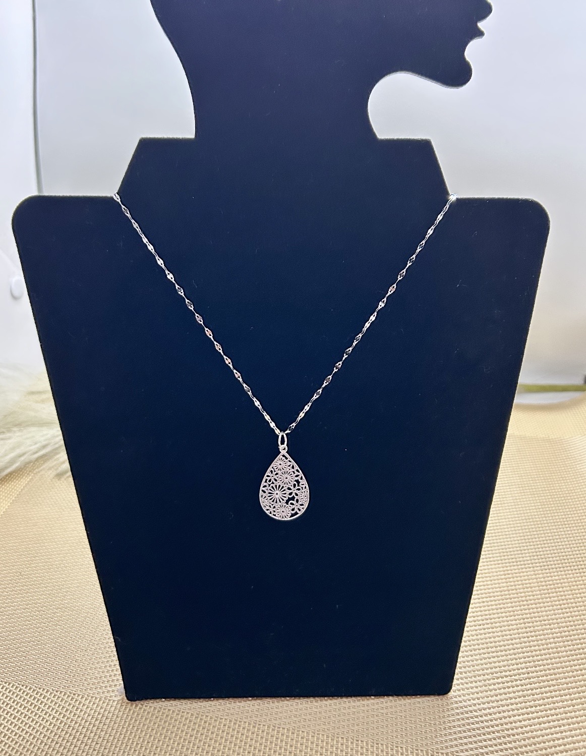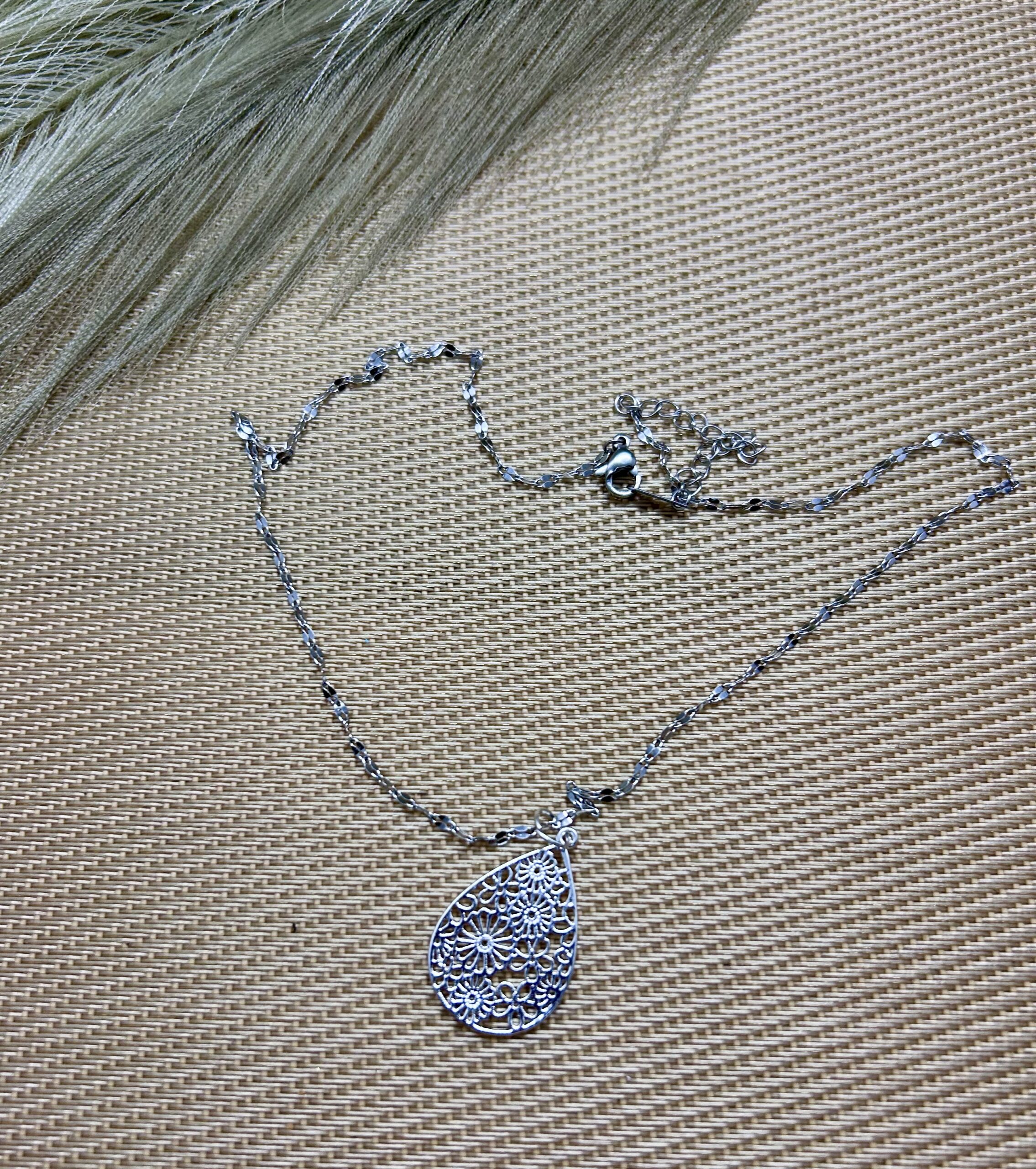 Silver plated filigree drop pendant necklace