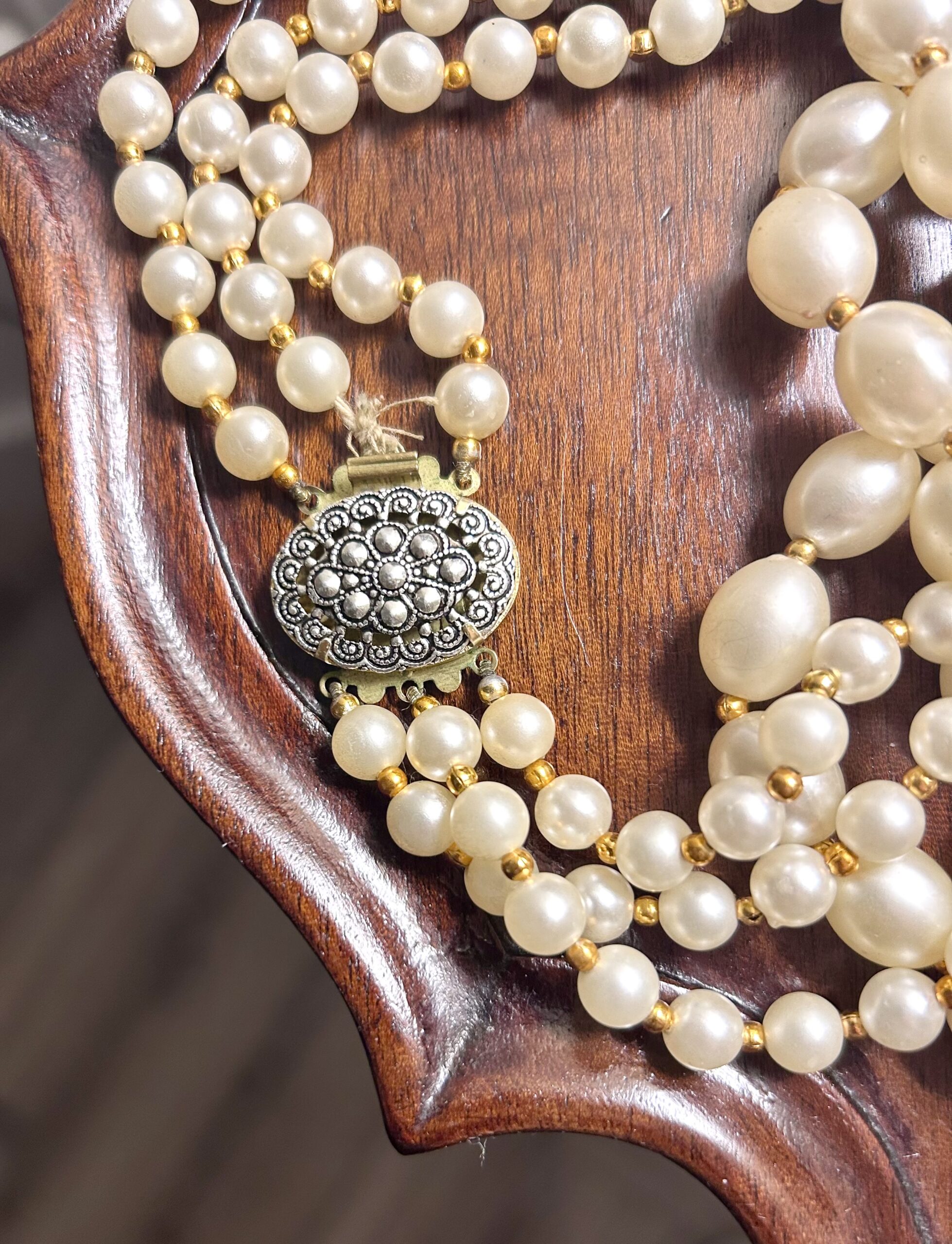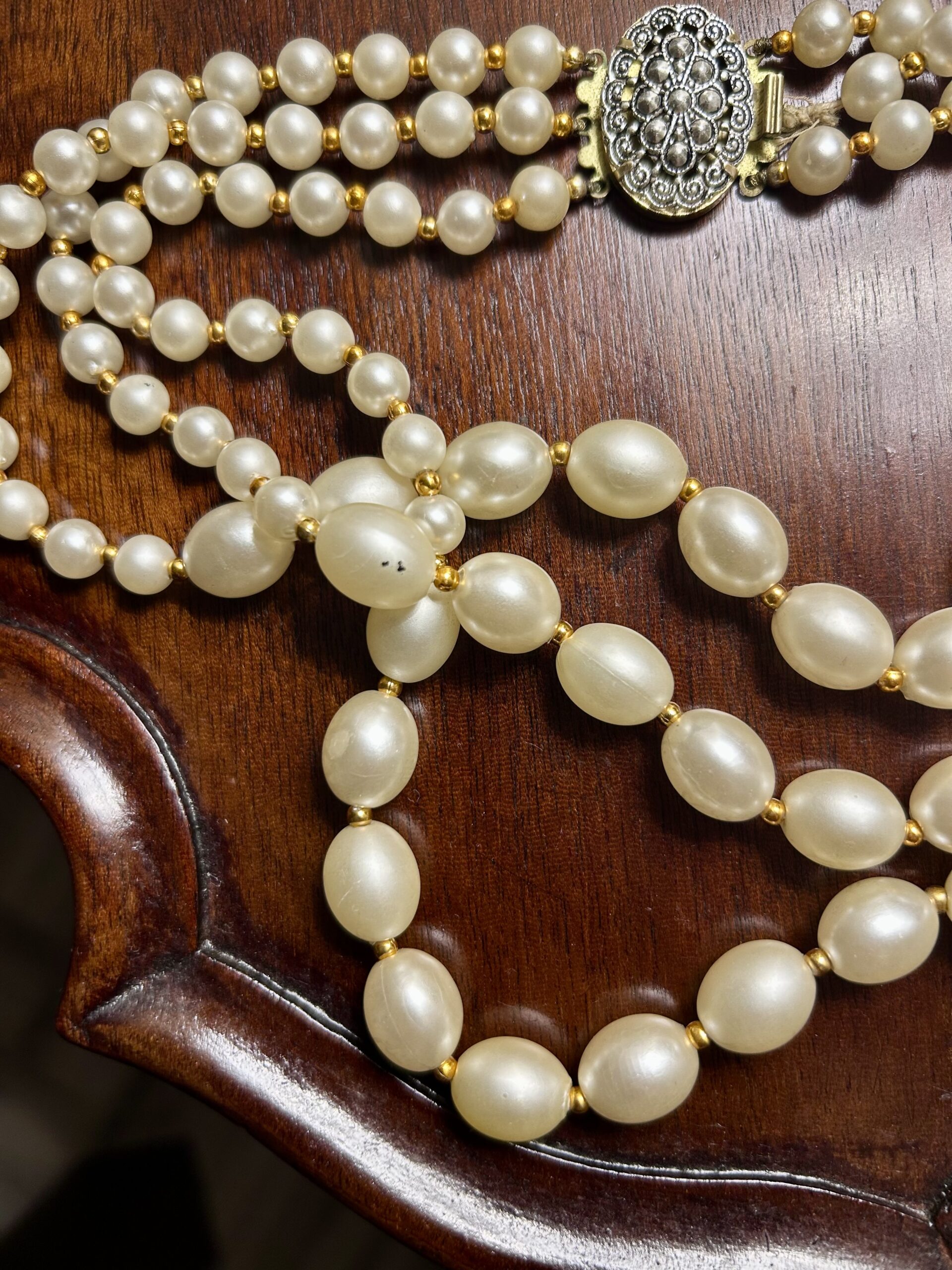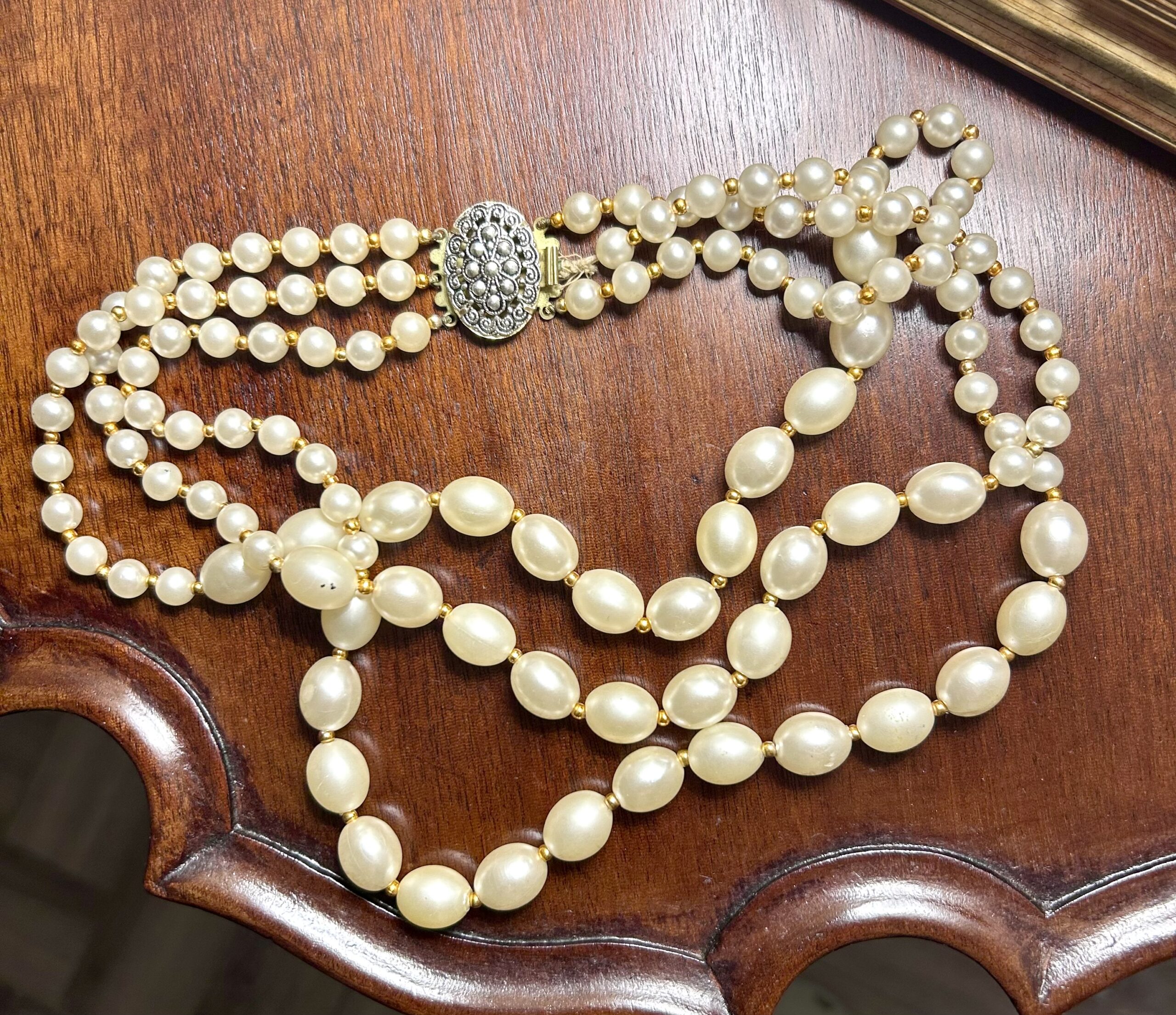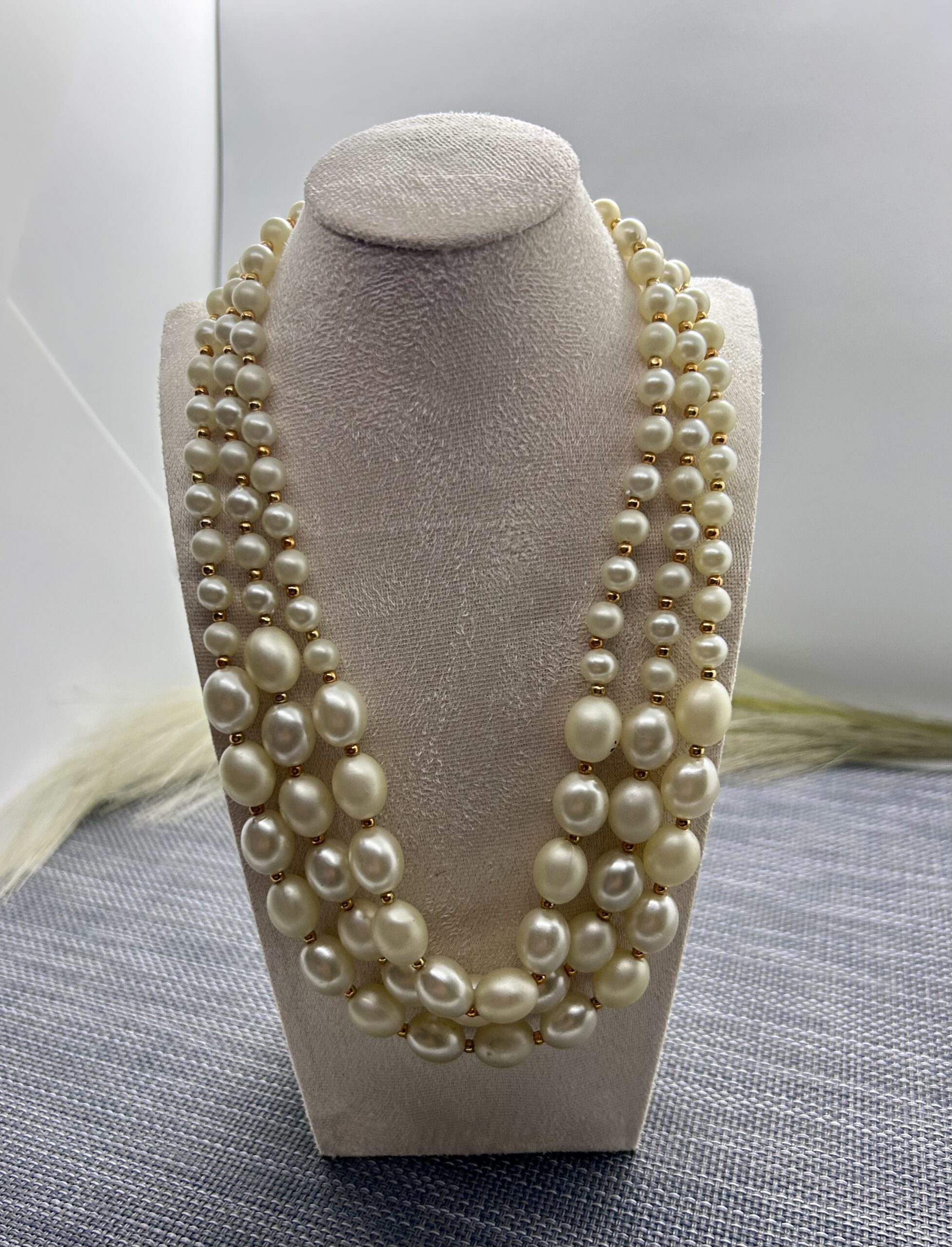 60’s triple strand faux pearl necklace. It has a couple slight imperfections as a vintage pieces, but not noticeable . See pictures. A lovely vintage pieces. This has a beautiful clasp.